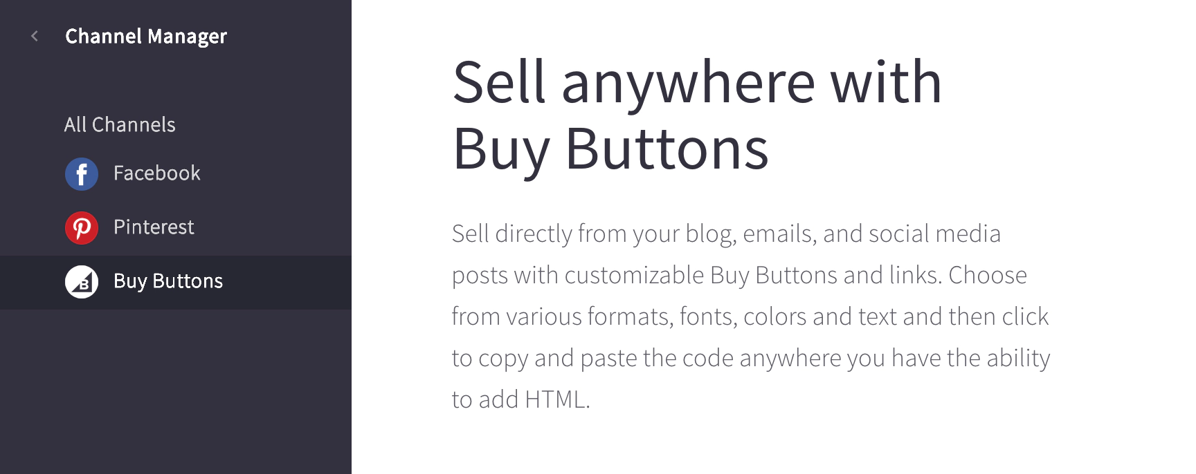 In order to create embeddable versions of your range of products, you’ll first need to add the Buy Button in the channel manager within the BigCommerce dashboard.